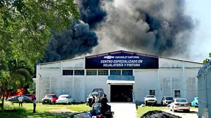 Daños materiales ante el siniestro de dos autos por lo menos fue el saldo de un incendio registrado en las instalaciones del taller de servicio de la agencia Chevrolet de la ciudad de Chetumal.
