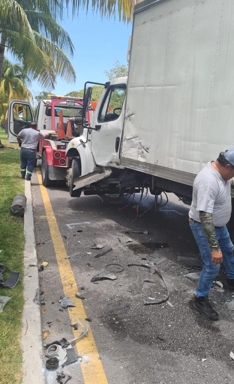 Cancún.- Esta mañana, el conductor de un camión provocó un aparatoso accidente, al cambiar de carril sin preocupación, provocando que una van se impactara en contra, a la altura del kilómetro 3 de la Zona Hotelera.