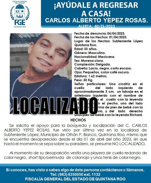 Horas después, la Fiscalía General del Estado desactivó la ficha de búsqueda de Carlos Alberto Yépez Rosas, de 33 años de edad, al marcarlo ya como “localizado”.