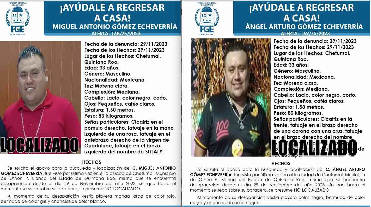 Así lo confirmó la noche de este jueves la Fiscalía General del Estado al desactivar las fichas de búsqueda de estos hombres que llevaban por nombre Ángel Arturo Gómez Echeverría y Miguel Antonio Gómez Echeverría.