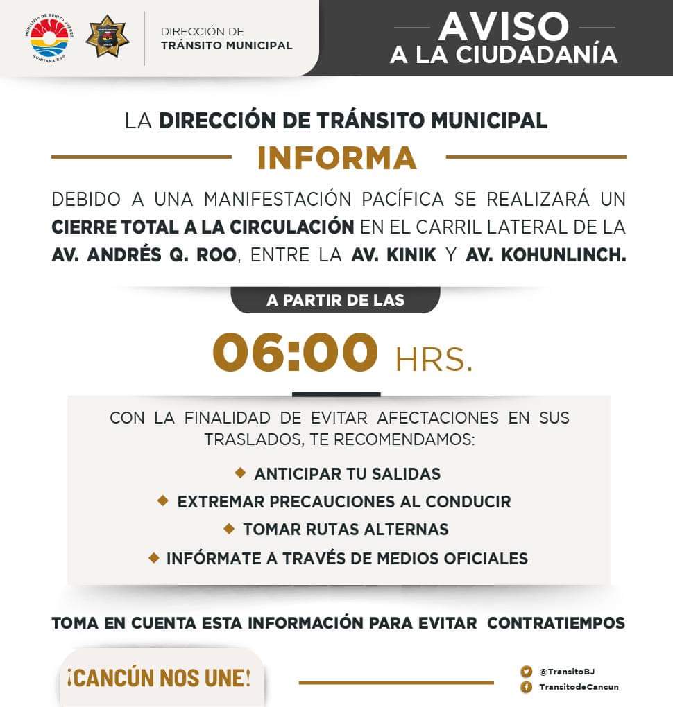 Desde las 6 de la mañana se ha implementado un cierre total a la circulación sobre la Av. Andrés Q. Roo, entre las avs. Kinik y Kohunlinch.