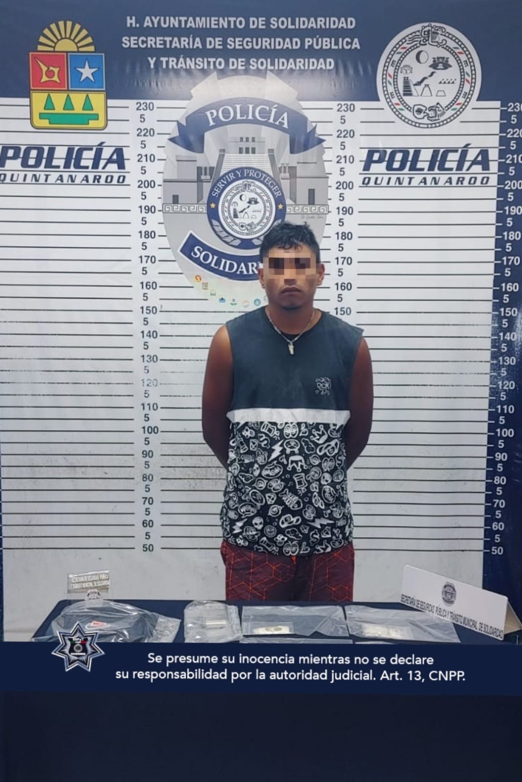Playa del Carmen, Solidaridad.- Durante un recorrido de vigilancia y prevención, policías de la Secretaría de Seguridad Pública y Tránsito Municipal de Solidaridad aseguraron a un sujeto en posesión de posibles narcóticos como piedra, cristal, cocaína y marihuana en la colonia Colosio