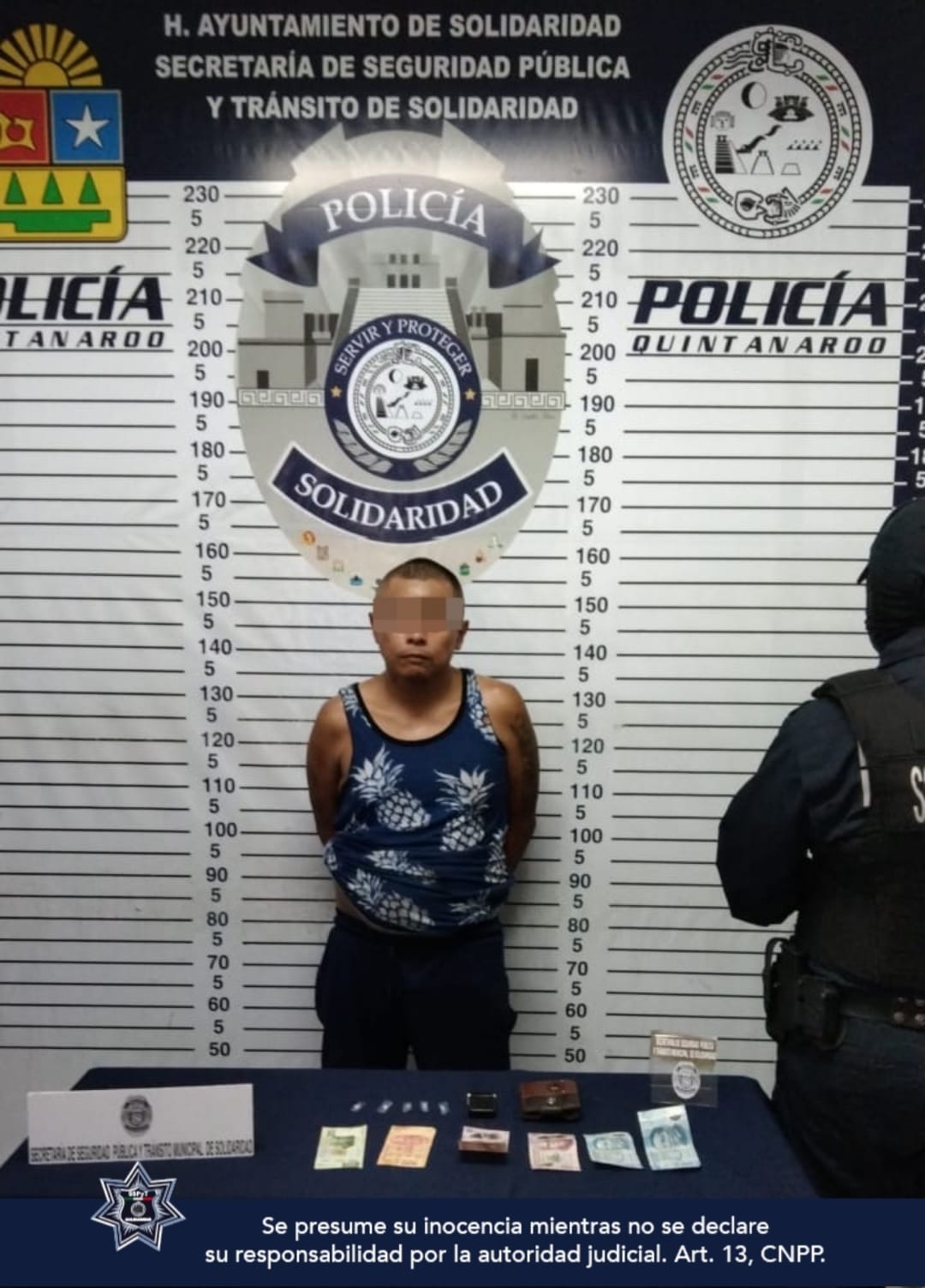 Playa del Carmen, Solidaridad.- Policías de la Secretaría de Seguridad Pública y Tránsito Municipal de Solidaridad aseguraron a un sujeto en posesión de posibles narcóticos en la colonia Ejido, durante un operativo de vigilancia y disuasión de delitos.
