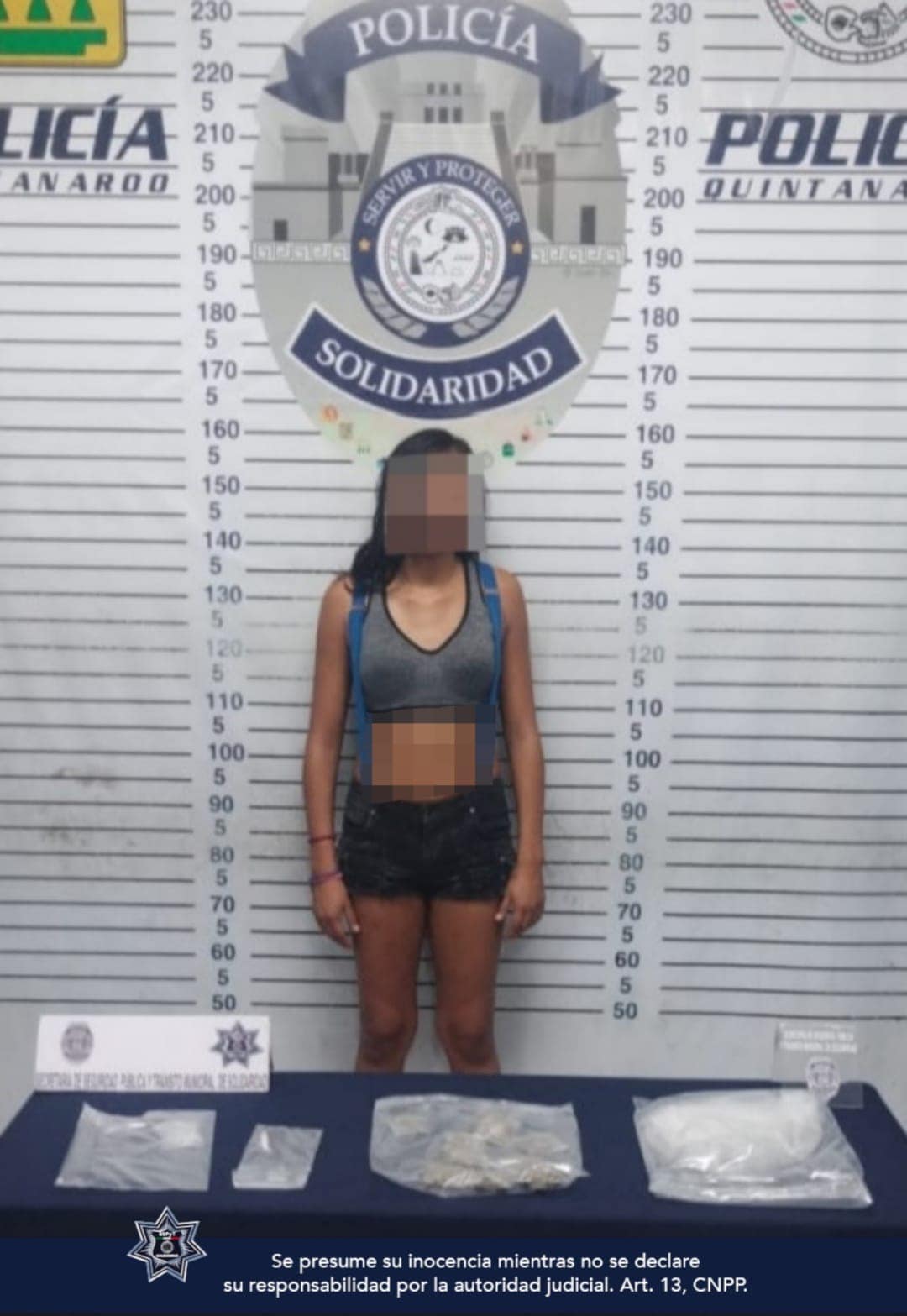 SOLIDARIDAD.- Una menor de edad en posesión de posibles narcóticos fue asegurada por policías de la Secretaría de Seguridad Pública y Tránsito Municipal de Solidaridad, durante el operativo de vigilancia en la zona habitacional conocida como Las Torres.