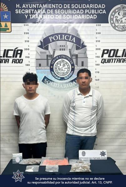 Durante la vigilancia en la colonia Ejido fueron asegurados Alexander “N” de 22 años de edad, originario de este estado y Uriel “N” de 22 años, de Campeche, quienes tenían 27 envoltorios con posible marihuana, 1 con lo que parece metanfetamina y 1 con posible cocaína. Fueron sorprendidos en un mototaxi con número económico 166 cuando estaba estacionado y ellos manipulaban los envoltorios.