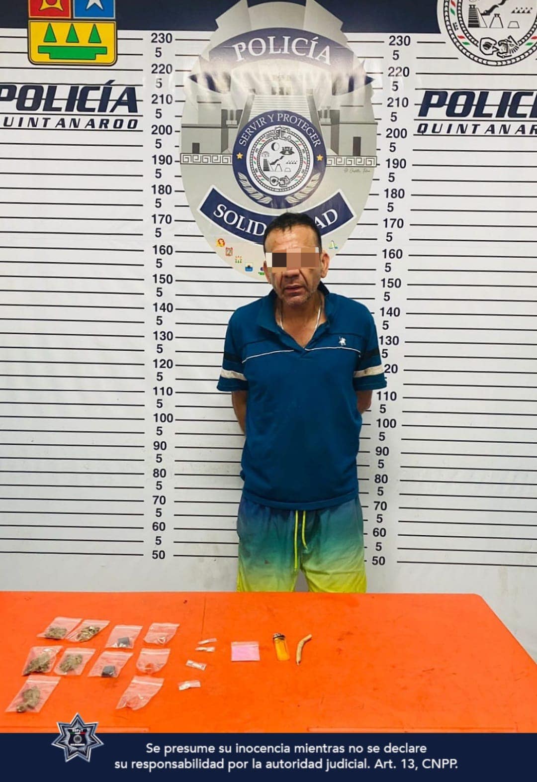 Mientras los oficiales se encontraban en recorridos de vigilancia sobre la calle 86 entre avenida 15 y avenida 20 la tarde del 14 de abril, aseguraron a Sergio “N” de 46 años de edad, originario de la Ciudad de México, en posesión de un cigarro y 5 bolsitas con un vegetal verde y seco con las características de la marihuana, 5 bolsitas que contenían gomitas de una sustancia a determinar, 4 bolsitas de una sustancia sólida con las características de la droga conocida como piedra y 1 bolsita con polvo de una sustancia a determinar.