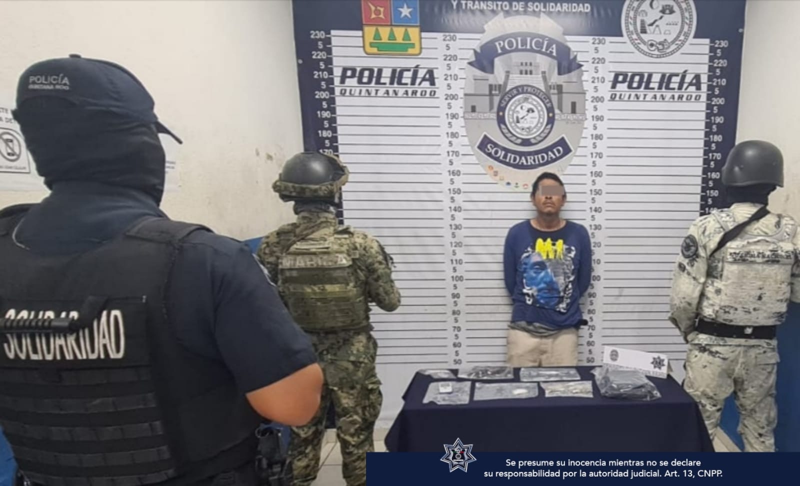 Playa del Carmen.- Con la reducción en el tiempo de respuesta a las llamadas de auxilio, un sujeto fue asegurado por elementos de la Secretaría de Seguridad Pública y Tránsito Municipal de Solidaridad, de la MARINA y la Guardia Nacional, en posesión de una réplica de arma de fuego y narcóticos como marihuana, cristal y crack.