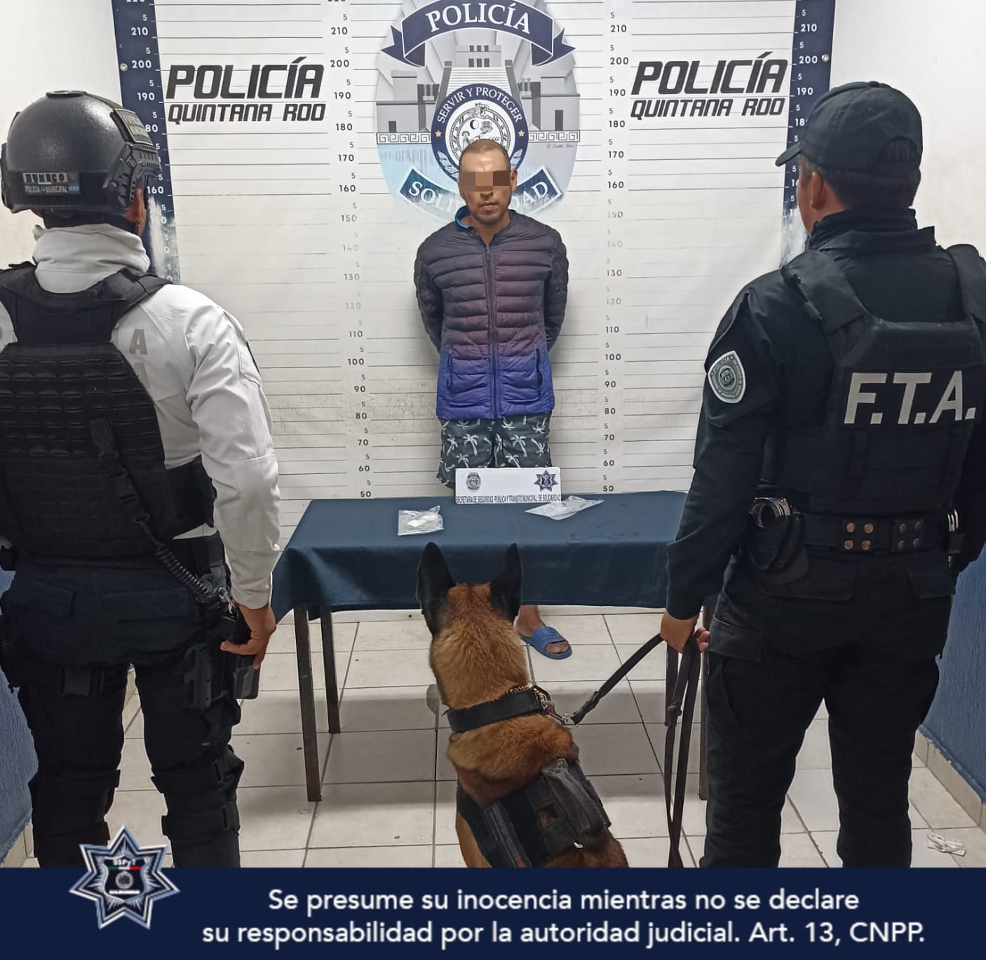 Elementos de la Policía Turística y la Unidad Canina recorrían la calle 2 entre avenidas 10 y 15 cuando un oficial canino le realizó un marcaje de alerta a quien se identificó como Aldo “N” de 36 años de edad, procedente de San Luis Potosí, mientras caminaba por la zona. Luego de intentar emprender la huida, fue asegurado y puesto a disposición de la Fiscalía General del Estado junto a 14 envoltorios con una sustancia similar a la cocaína.