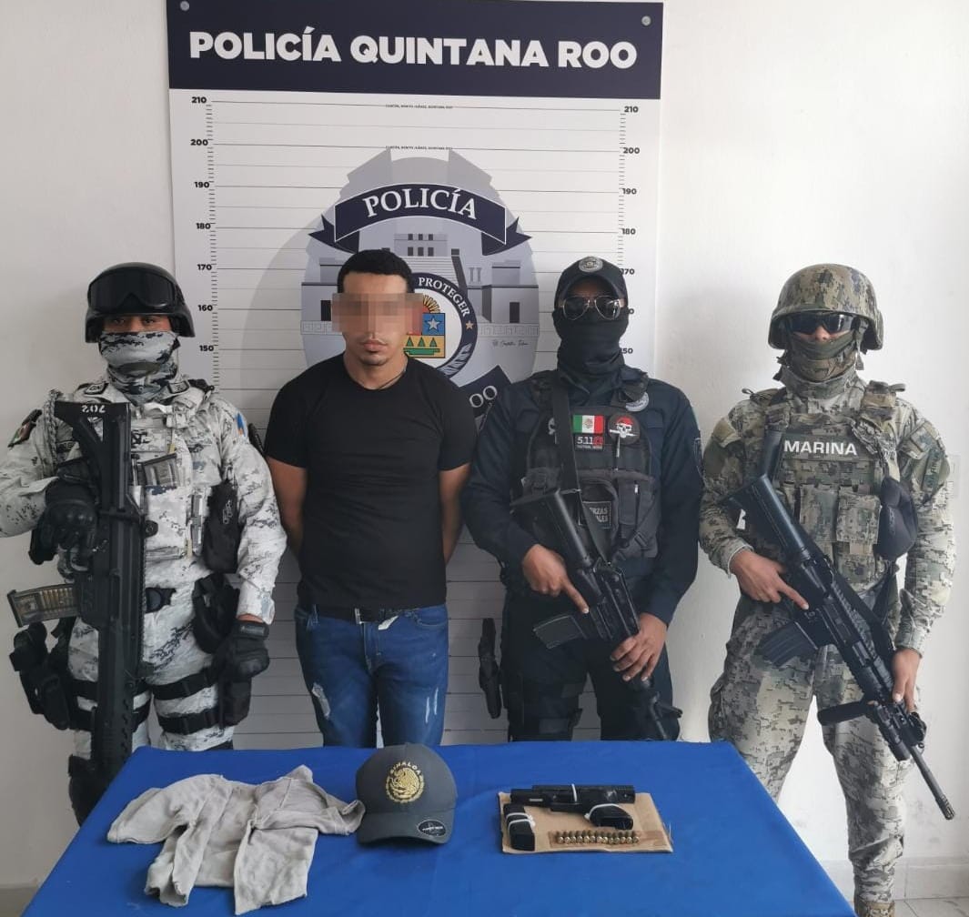 Este sujeto fue aprehendido luego que oficiales atendieron un reporte de detonaciones de arma de fuego en el Ejido Alfredo V. Bonfil, en la Supermanzana 308.