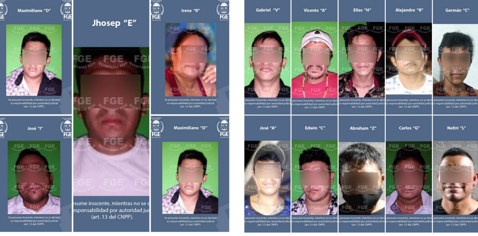 Los imputados, José “A”, Neltri “L”, Alejandro “R”, Jesús “C”, Germán “C”, Abraham “B”, Irene “R”, José “I”, Carlos “G”, Vicente “A”, Edwin “C”, Jhoser “E”, Elías “H”, Gabriel “V” y Maximiliano “D” fueron detenidos en Tulum, tras cumplimentar órdenes de cateo por policías de investigación apoyados por personal del Grupo de Coordinación para la Construcción de la Paz y Seguridad conformado por la Policía Quintana Roo, SEDENA, Marina y Guardia Nacional.