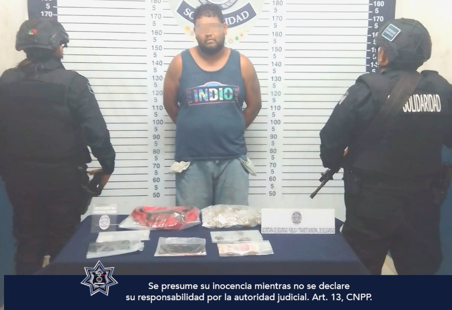 Playa del Carmen, Solidaridad.- Como resultado del refuerzo de mayor vigilancia policial en las colonias, un sujeto fue asegurado en posesion de posible droga como marihuana, crack y cristal, en el fraccionamiento Villas del Sol.