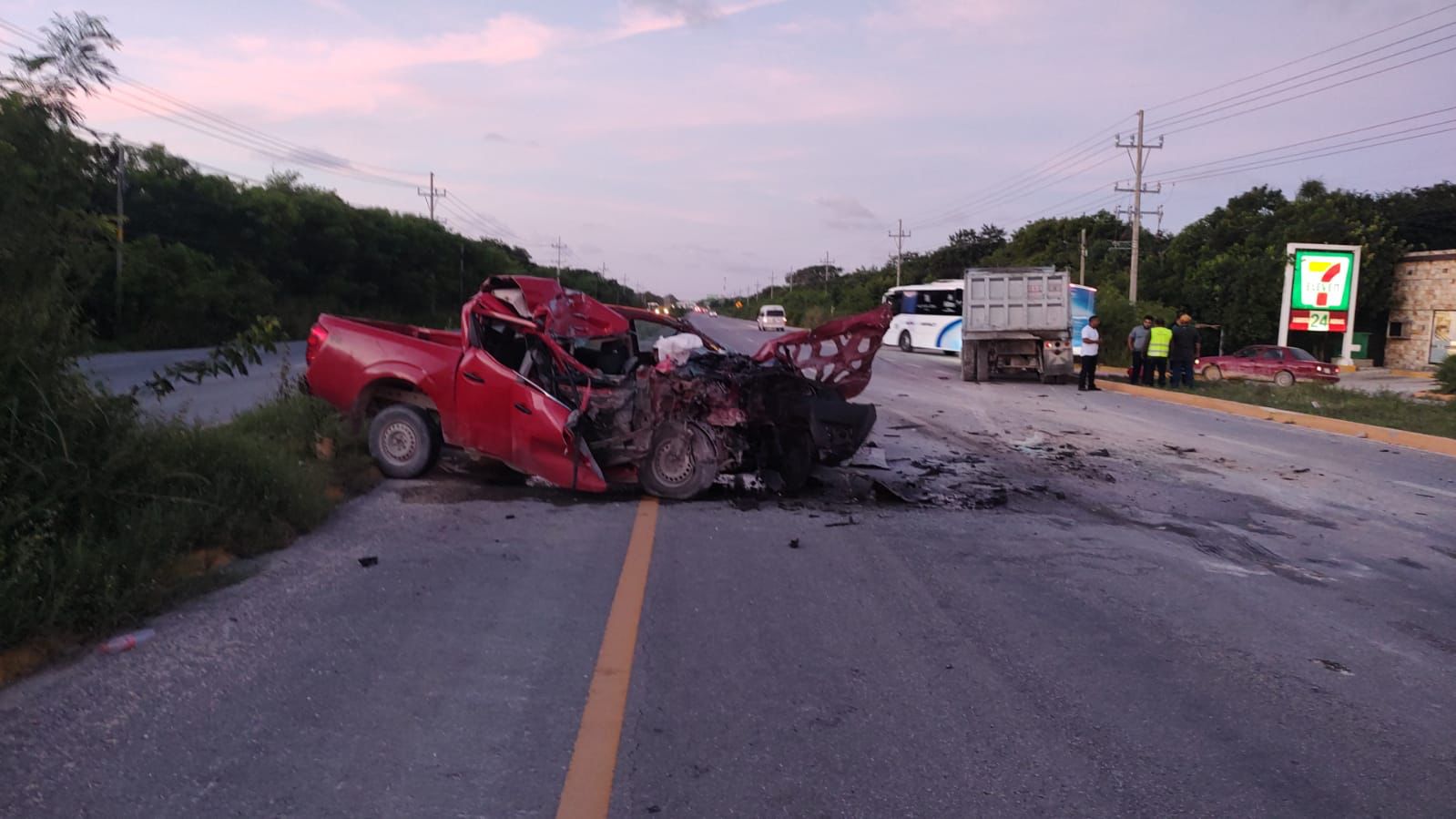 Los hechos ocurrieron cerca del poblado de Chemuyil, donde una camioneta roja colisionó con la parte trasera de un volquete, dejando los cuerpos de las víctimas prensadas entre los fierros de la unidad, quienes murieron al instante.