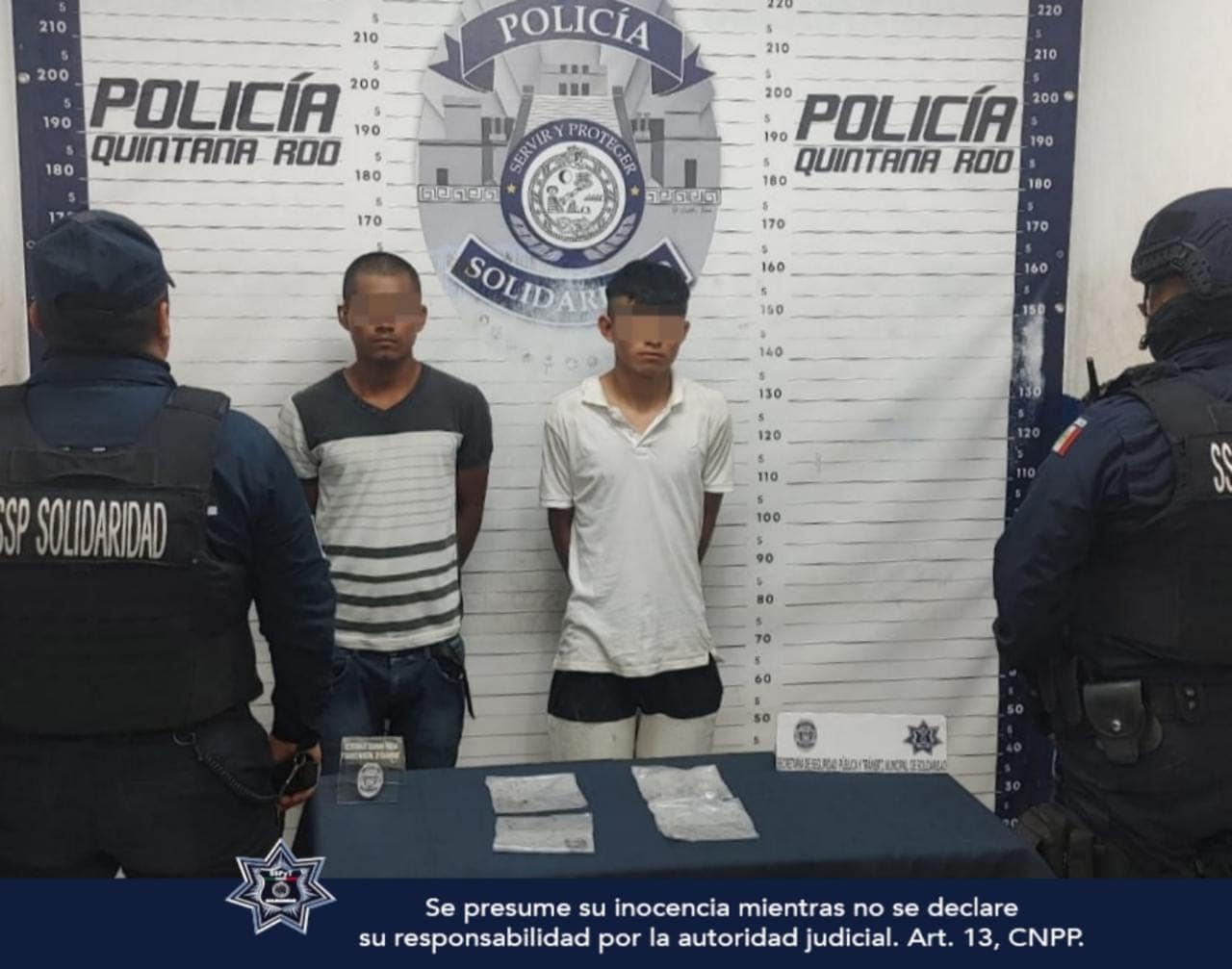 Víctor “N”, de 18 años, originario de Quintana Roo y Ángel “N”, igual de 18 años, originario de Tabasco, fueron detenidos por elementos de la Policía Preventiva en la avenida Chichén, de la colonia In House, con 30 envoltorios con lo que parece la droga llamada cristal, una con posible cocaína y una con la posible droga conocida como piedra, tras ser sorprendidos intercambiando entre ellos los envoltorios.