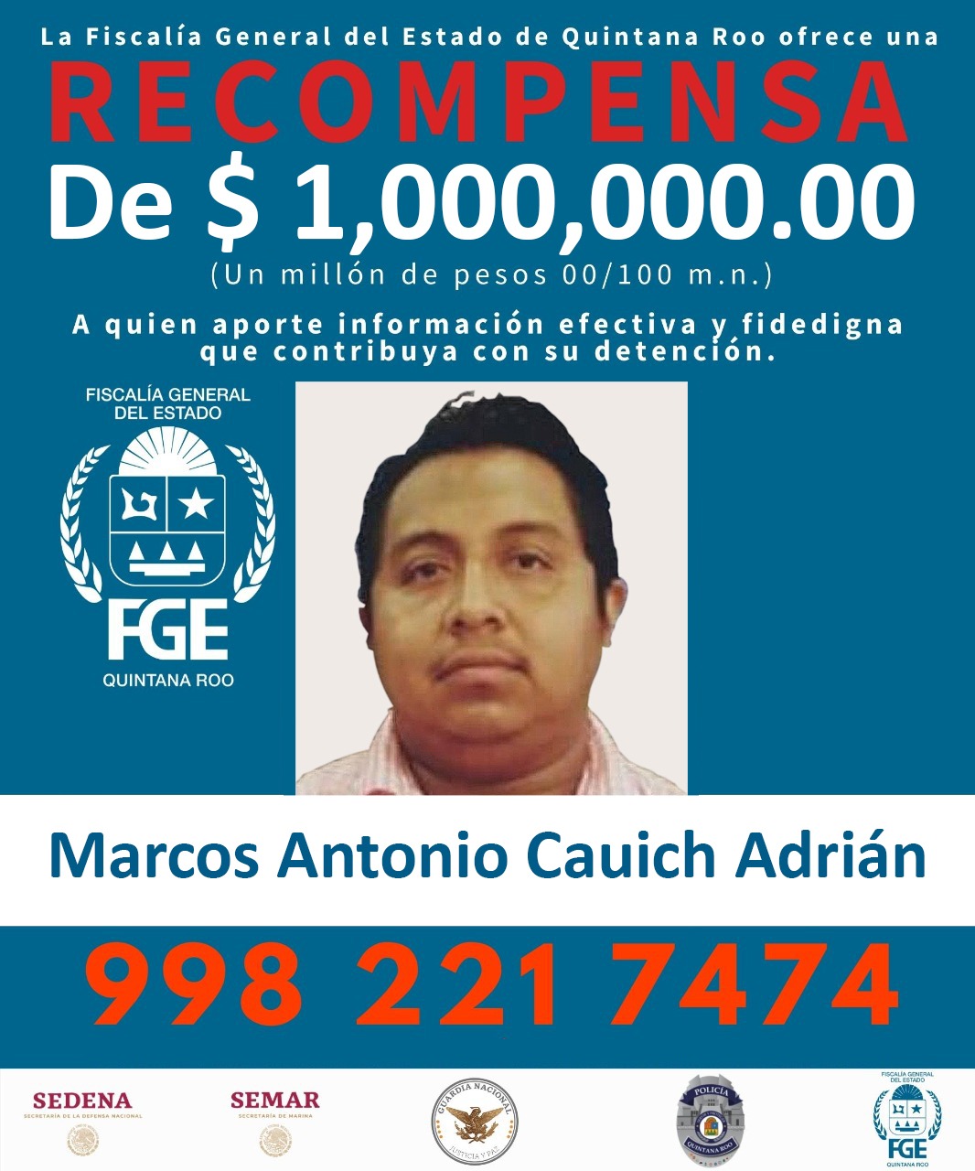 Derivado del contexto y la dirección que lleva la investigación de este caso, -con base al acuerdo de pago de compensaciones económicas-, a quienes proporcionen información fidedigna y confiable que ayude a la localización y captura de Marcos Antonio Cauich Adrián, la FGE de Quintana Roo ya emitió una publicación mediante la cual ofrece 1 millón de pesos.