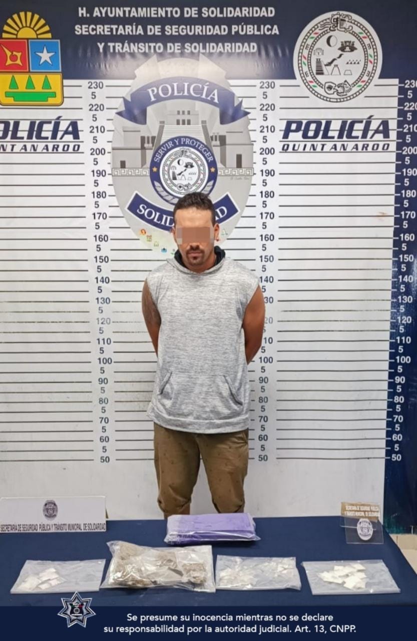 Playa del Carmen .- Policías de la Secretaría de Seguridad Pública y Tránsito Municipal de Solidaridad aseguraron a una persona en posesión de más de 70 posibles dosis de narcóticos como marihuana, cocaína, piedra y cristal, durante el operativo permanente de vigilancia en la colonia el Pedregal.