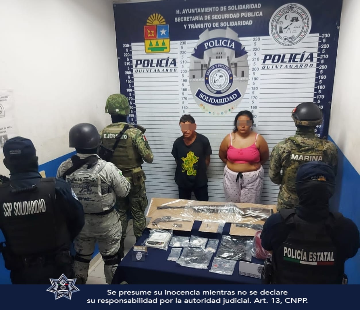 Playa del Carmen.- El trabajo coordinado entre la Secretaría de Seguridad Pública y Tránsito Municipal de Solidaridad, Policía Quintana Roo, MARINA, SEDENA y Guardia Nacional, permitió el aseguramiento de un hombre y una mujer, bolsitas con diversos tipos de narcóticos, dos armas de fuego, una réplica de arma y cartuchos útiles, en la colonia Colosio.