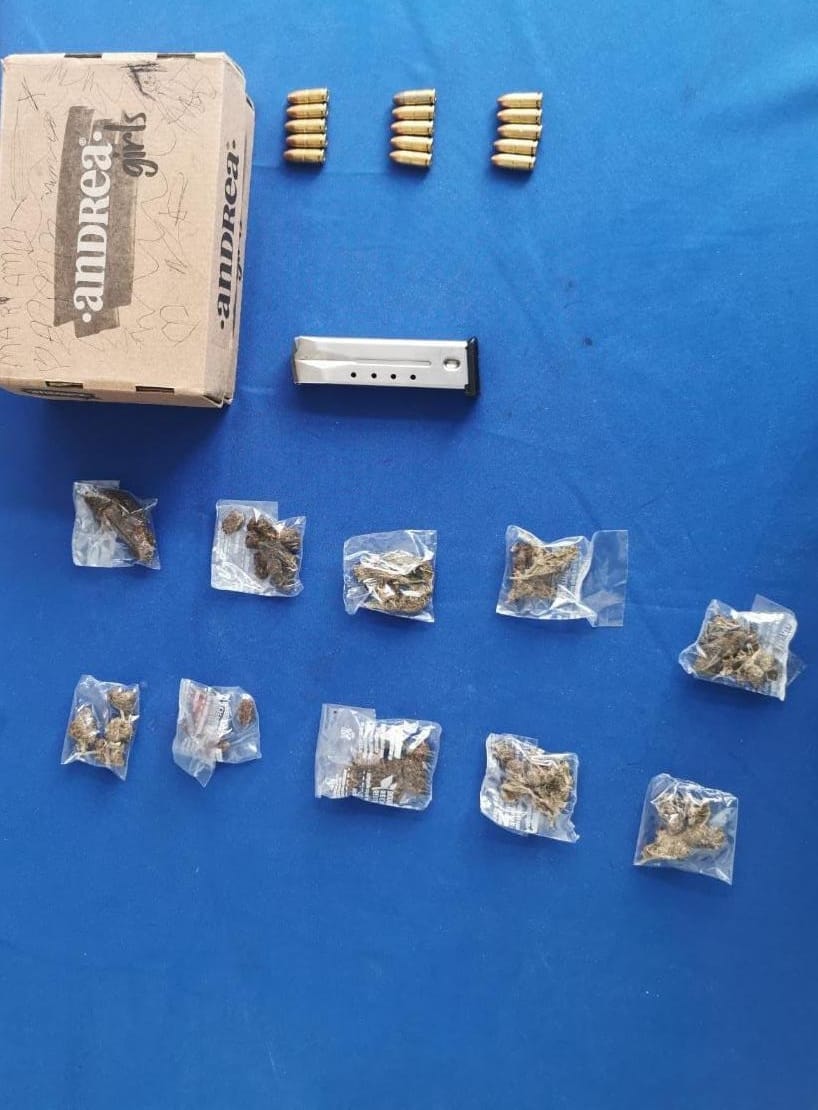Ante tal situación, los agentes le marcaron el alto al conductor, y al realizar una inspección de la unidad motriz fue localizada una caja en la cual se encontró un cargador para arma de fuego con 15 cartuchos útiles, calibre 9. mm y 10 bolsas pequeñas que en su interior contenían hierba seca con características similares a la marihuana.