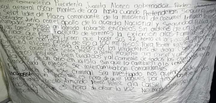 “Gente cozumeleña presidenta Juanita Alonso gobernador Pedro Joaquín fiscal oscar Montes de Oca hasta cuando pretenden seguir permitiendo al Señor líder de plaza comandante de la Ministerial de Cozumel Armando Pérez alias el contador junto con el apoyo de la guardia nacional y seguridad pública y sus encargados de Plaza han logrado robarse en cateos sin órdenes de un juez dinero alhajas carros motos facturas de terrenos la extorsión a las familias de los detenidos que por ley tienen que hacer sus 72 horas en la fiscalía aprovechan a extorsionar con montos de 50 a $100 mil pesos para poder recuperar su libertad Asi mismo el cobro de cuota a todos los vendedores de droga clandestinos prostíbulos casinos este señor mete a gente inocente a la cárcel y a los verdaderos malandros los tiene bien cuidados y al corriente de todos los operativos en la isla más de un año en la isla sin que lo cambien o lo remuevan cuando cada 6 meses se intercambiaban comandantes pido justicia que esté criminal sea investigado nos quitaste todo eh inculpaste a un inocente es hora de que pagues por todas las que te has beneficiado y hecho Armando Pérez Pérez a la cárcel basta de callar es hora de alzar la voz nomás corrupción e impunidad”.