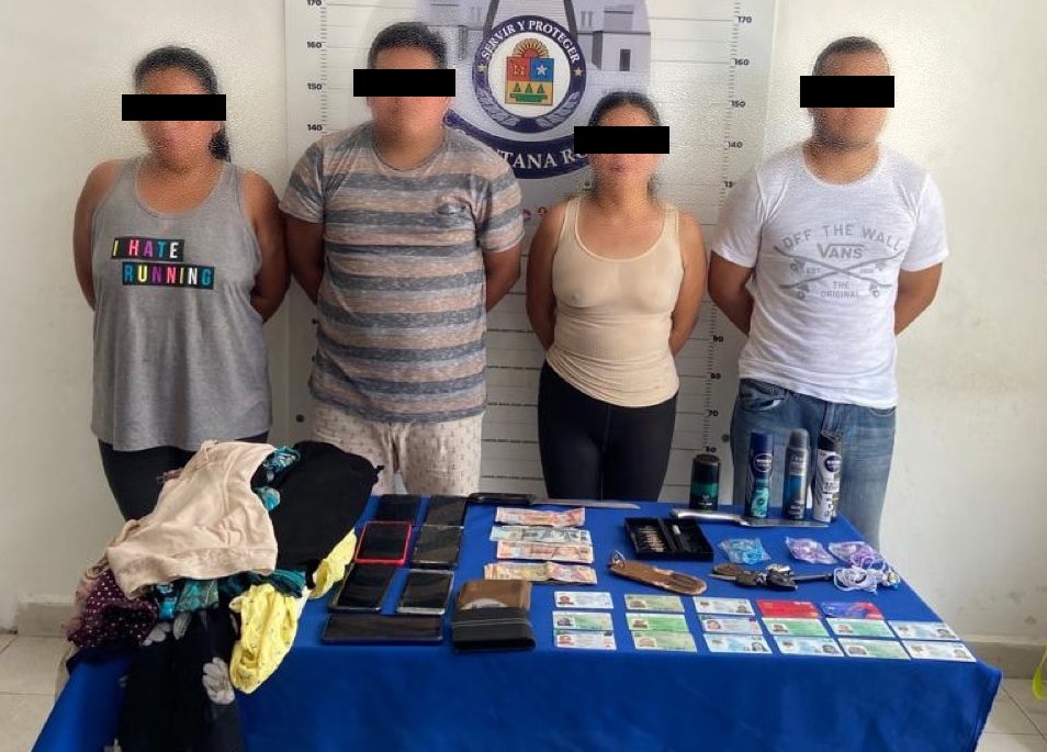 Elementos de la Policía Quintana Roo Benito Juárez detuvieron a quienes dijeron llamarse Carlos Enrique “N”, Omar Estuardo “N”, Lucrecia “N” y Diana Maribel “N”, por los delitos de resistencia a particulares y portación de arma prohibida.