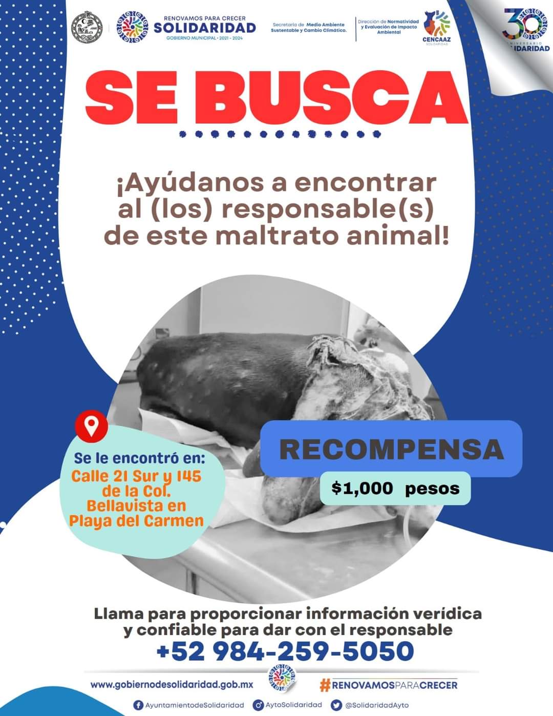 Por su parte, el Ayuntamiento ofreció una recompensa de mil pesos a quien ayude a encontrar a los responsables de este maltrato animal.
