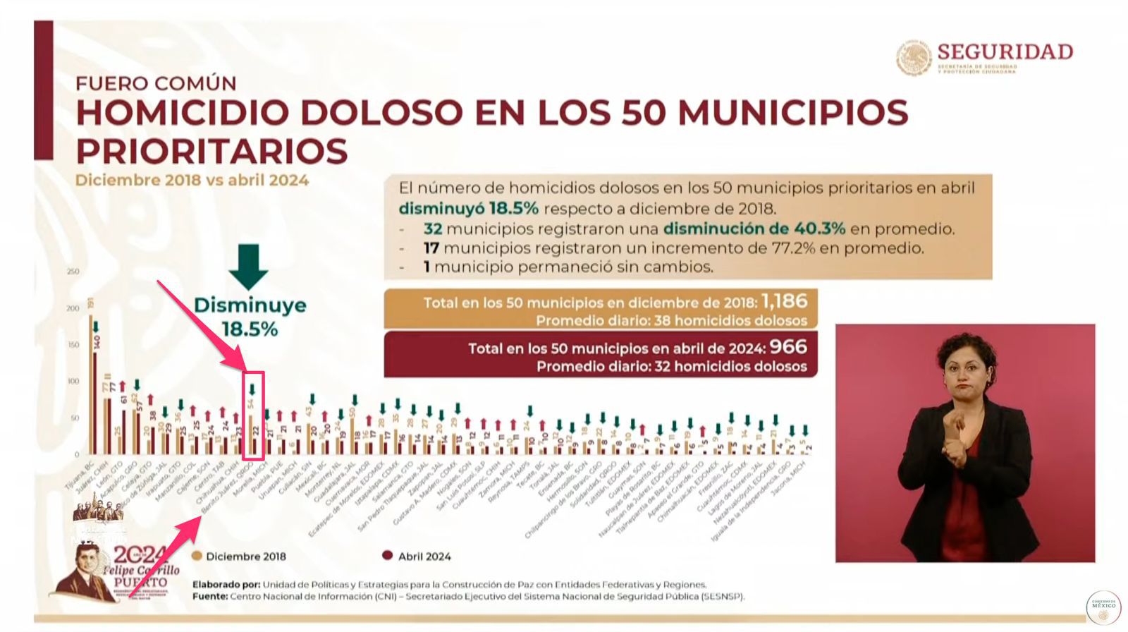 Además, el municipio de Benito Juárez logró una disminución en homicidios dolosos, pasando de 54 homicidios en abril de 2018 a 22 en abril de 2024, según el reporte de los 50 municipios prioritarios.