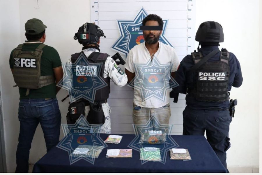 Cancún.- Durante un patrullaje del operativo Blindaje Cancún, elementos de la Secretaría Municipal de Seguridad Ciudadana y Tránsito de Benito Juárez detuvieron a un hombre en posesión de diversas sustancias con características similares a drogas, en la colonia Tres Reyes.