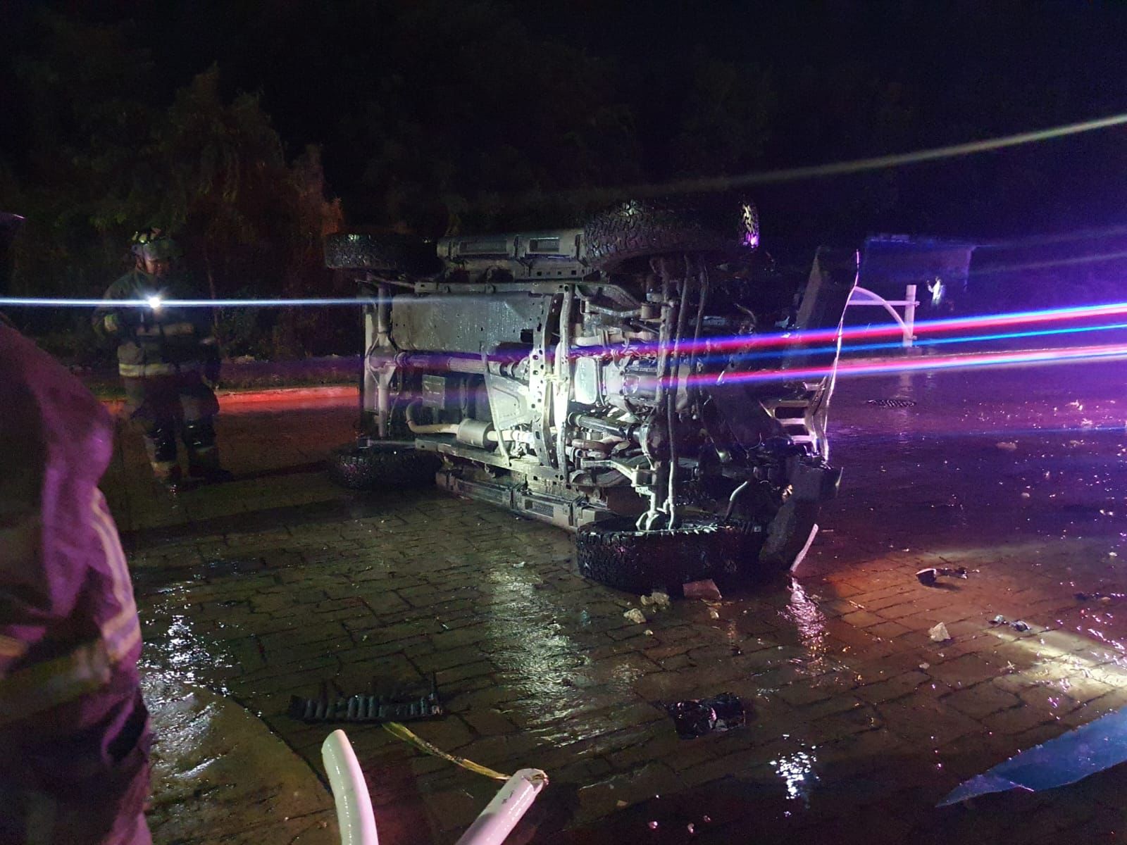 Cancún.- Un aparatoso accidente se registró la madrugada de este jueves sobre la avenida Enrique Saviñac, donde una camioneta tipo Jeep terminó volcada.