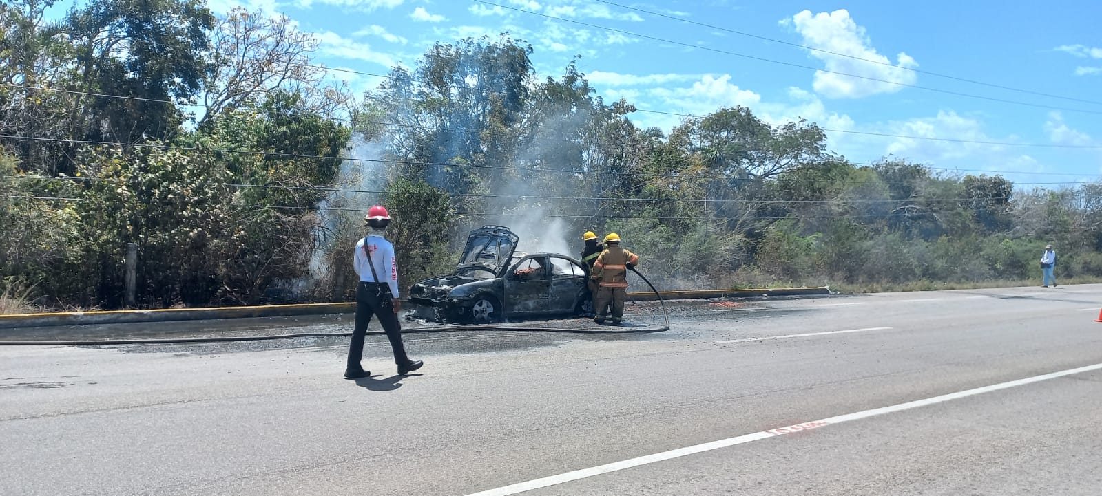 El vehículo se incendió repentinamente cuando circulaba en dirección a Playa del Carmen. A bordo iban el conductor y su hermanito, quienes alcanzaron a descender antes de que el fuego cubriera toda la unidad.