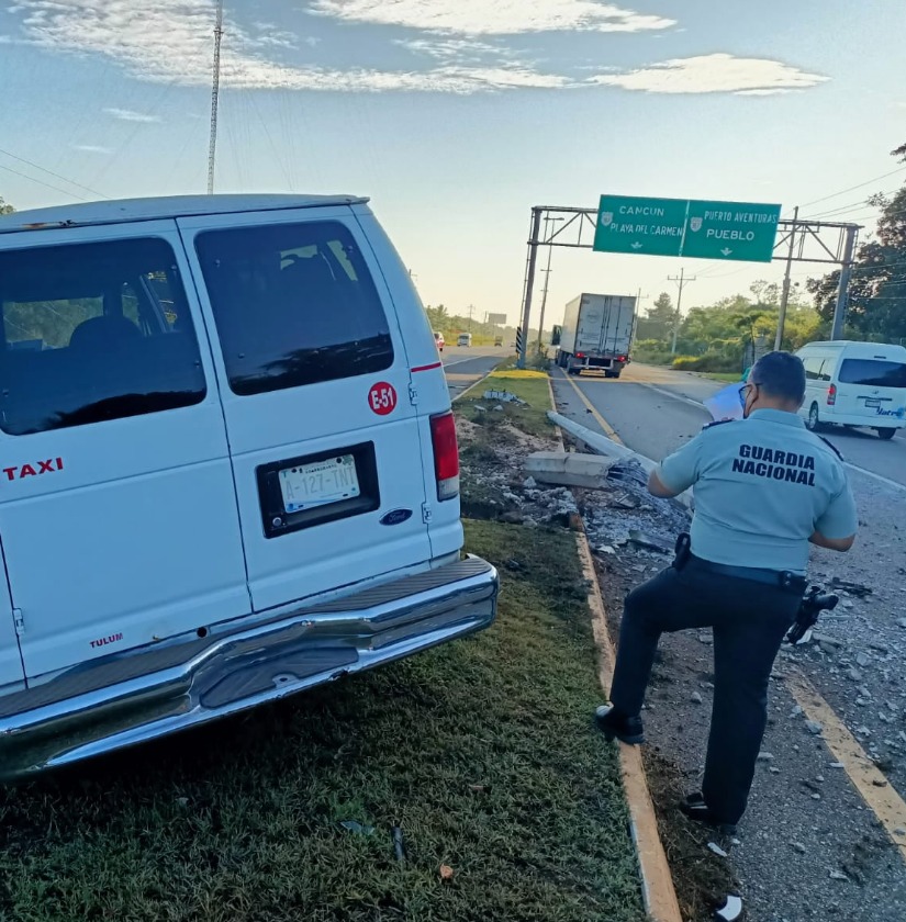 PLAYA DEL CARMEN.- Conductor de transporte foráneo estuvo a punto de ocasionar una tragedia al manejar cansado, toda vez que al dormitar chocó contra un poste de luz y dejó estragos en la carretera federal Playa del Carmen, cerca del hotel Barceló.