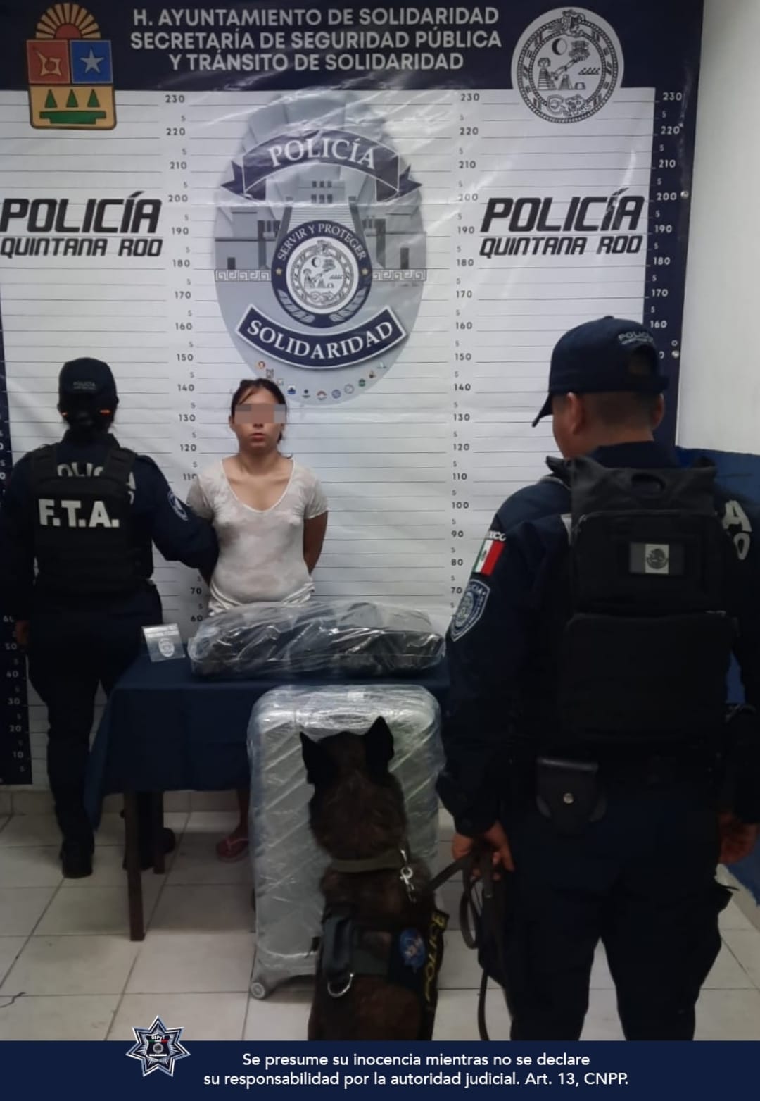 Playa del Carmen, Solidaridad.- Policías de la Unidad Canina de la Secretaría de Seguridad Pública y Tránsito Municipal, aseguraron a una mujer que ingresó al municipio una maleta cargada con 5 paquetes que contienían posible marihuana, durante el operativo de vigilancia realizado en los puntos de acceso a la ciudad con el fin de prevenir delitos.