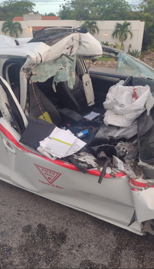 TULUM.-Un aparatoso accidente se registró la mañana de hoy en el tramo carretero Tulum-Felipe Carrillo Puerto, en el percance se vieron involucrados un taxi del Sindicato de Taxistas de Tulum “Tiburones del Caribe” y un tráiler.