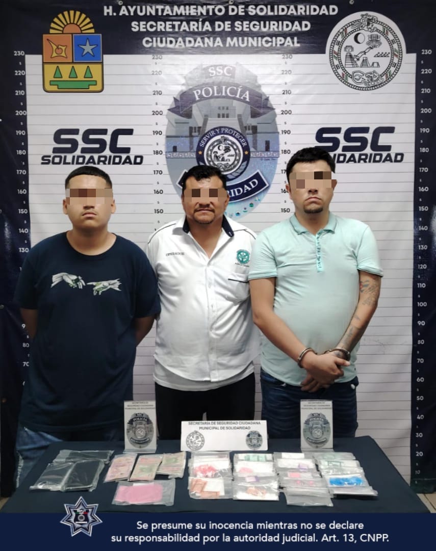 PLAYA DEL CARMEN.- Como resultado de una acción operativa de respuesta inmediata, la Policía Municipal de Solidaridad aseguró a 3 sujetos y más de 60 posibles dosis de narcóticos en la colonia Misión del Carmen.