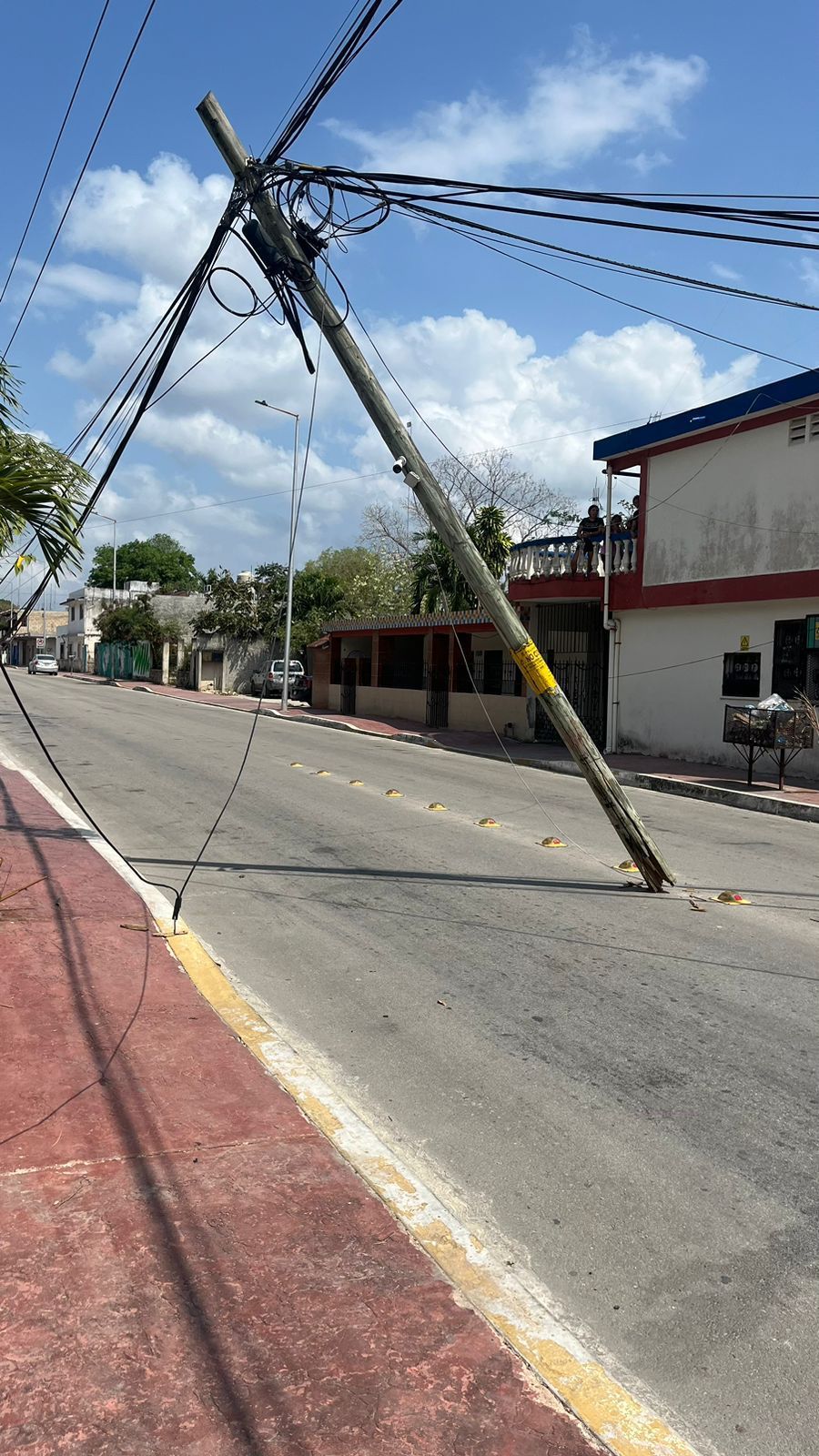 FELIPE CARRILLO PUERTO.- Luego que un tráiler derribó postes de internet y de alumbrado público trajo como consecuencias, afectación a usurarios y una calle bloqueada en céntrica ciudad de Felipe Carrillo Puerto.