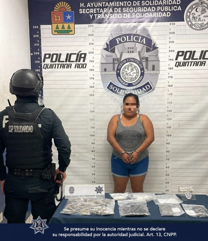 Elizabeth “N” de 25 años de edad, originaria de Chiapas, fue asegurada durante la tarde cuando elementos de la Policía Preventiva realizaban acciones de vigilancia y prevención en el fraccionamiento Villas del Sol. Ella caminaba sobre la banqueta cuando al notar la presencia policial mostró una actitud evasiva e intentó emprender la huída dejando caer al suelo una bolsa que contenía 70 envoltorios con posible marihuana, 5 con lo que parece la droga llamada cristal, 44 con un polvo al parecer cocaína, 72 con posible crack y dos teléfonos celulares.