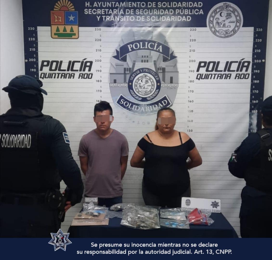 PLAYA DEL CARMEN.-Policías de la Secretaría de Seguridad Pública y Tránsito Municipal de Solidaridad aseguraron a una mujer, 1 hombre, 1 arma de fuego y más de 80 envoltorios con posibles narcóticos en el fraccionamiento Puerto Maya.