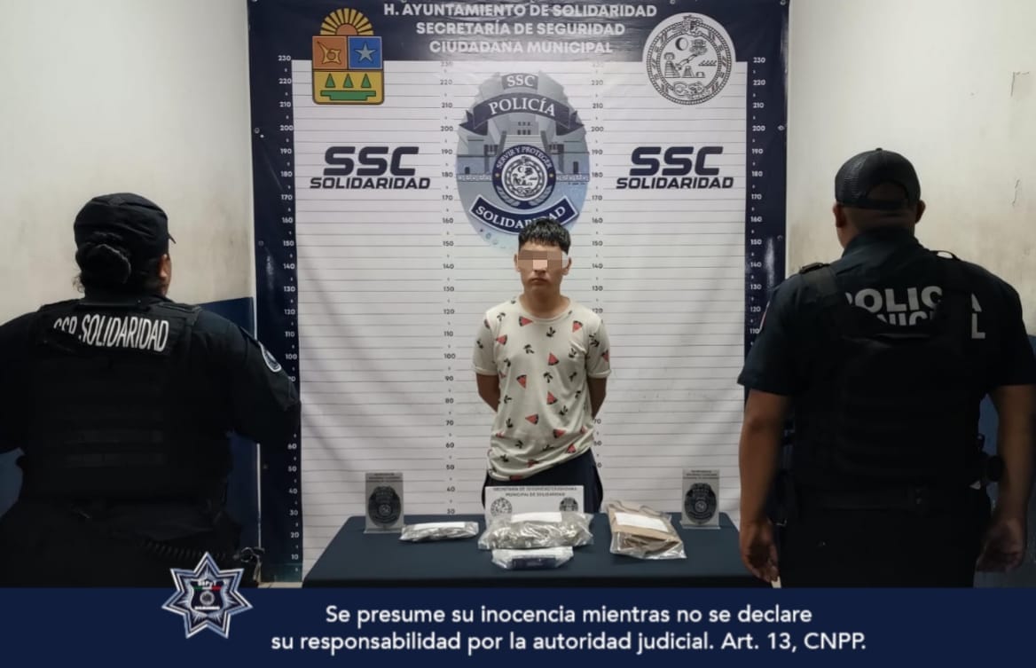 PlayaDelCarmen.- La Policía Municipal de Solidaridad aseguró a una persona en posesión de posibles narcóticos como parte de un operativo de vigilancia para prevenir y disuadir el delito.