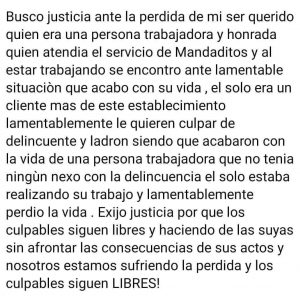 “Busco justicia ante la perdida de mi ser querido, quien era una persona trabajadora y honrada quien atendía el servicio de Mandaditos y al estar trabajando se encontró ante lamentable situación que acabo con su vida. Él solo era un cliente más de este establecimiento”, escribió.