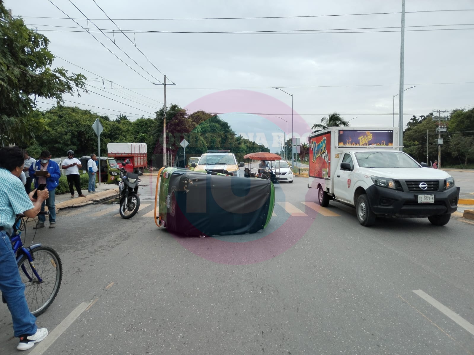 El incidente involucró un Chevrolet Aveo rojo y un mototaxi TVS verde, resultando el último volcado tras el siniestro.