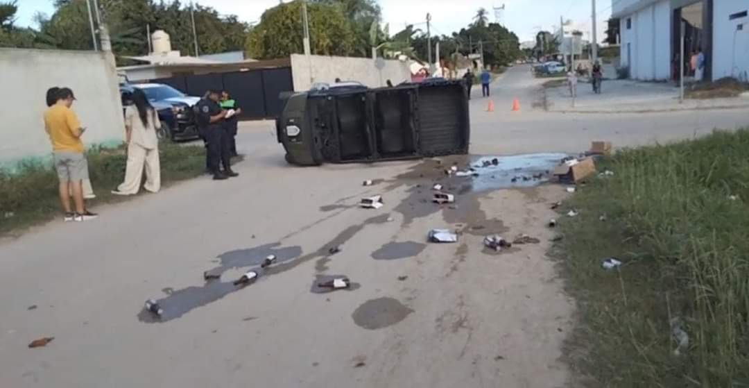 Estos hechos ocurrieron sobre la avenida 11 con 16 y 18, donde el conductor de la camioneta perdió el control de la unidad y terminó volcado, con las cervezas regadas sobre la calle.