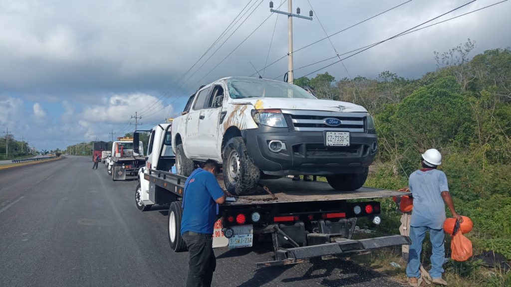 Playa del Carmen.- Diez personas lesionadas de gravedad, fue el saldo de accidente en el que una camioneta de redilas que transportaba a trabajadores del tren maya se volcó esta mañana, el accidente ocurrió en en el tramo Playa del Carmen-Tulum.