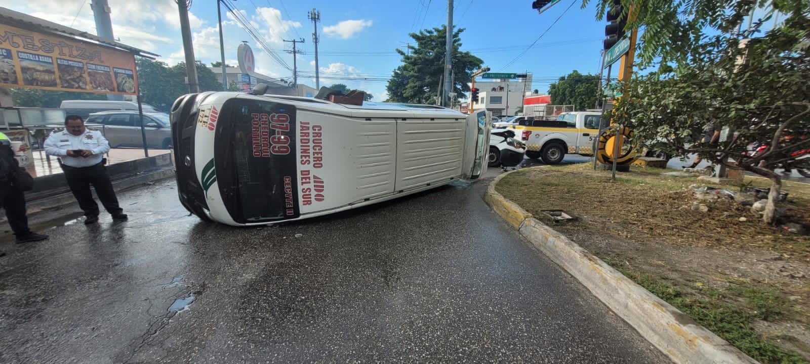 Primeros informes refieren que esta combi, que venía prácticamente vacía, no respetó la luz roja del semáforo e intentó ganarle el paso a los vehículos del sentido de la avenida Nichupté.