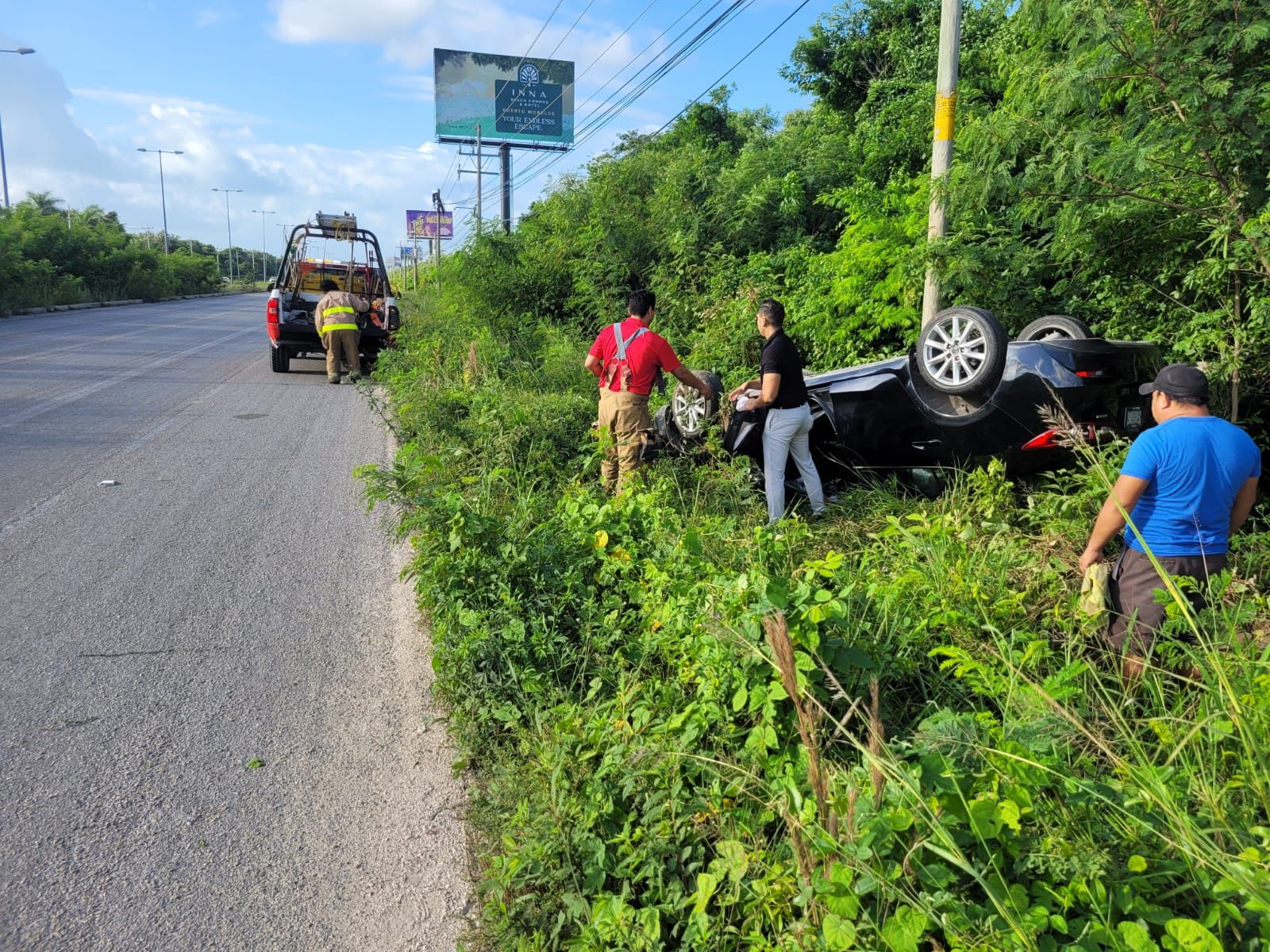 PUERTO MORELOS.- Un conductor perdió el control de su auto, ocasionando que terminara volcado esta mañana, a un lado de la maleza, en el tramo carretero Cancún-Playa del Carmen.