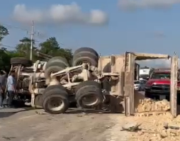 FELIPE CARRILLO PUERTO.-Un camión tipo volquete que transportaba material para las obras del Tren Maya, se volcó en el entronque del poblado de X-Hazil, sin dejar lesionados.