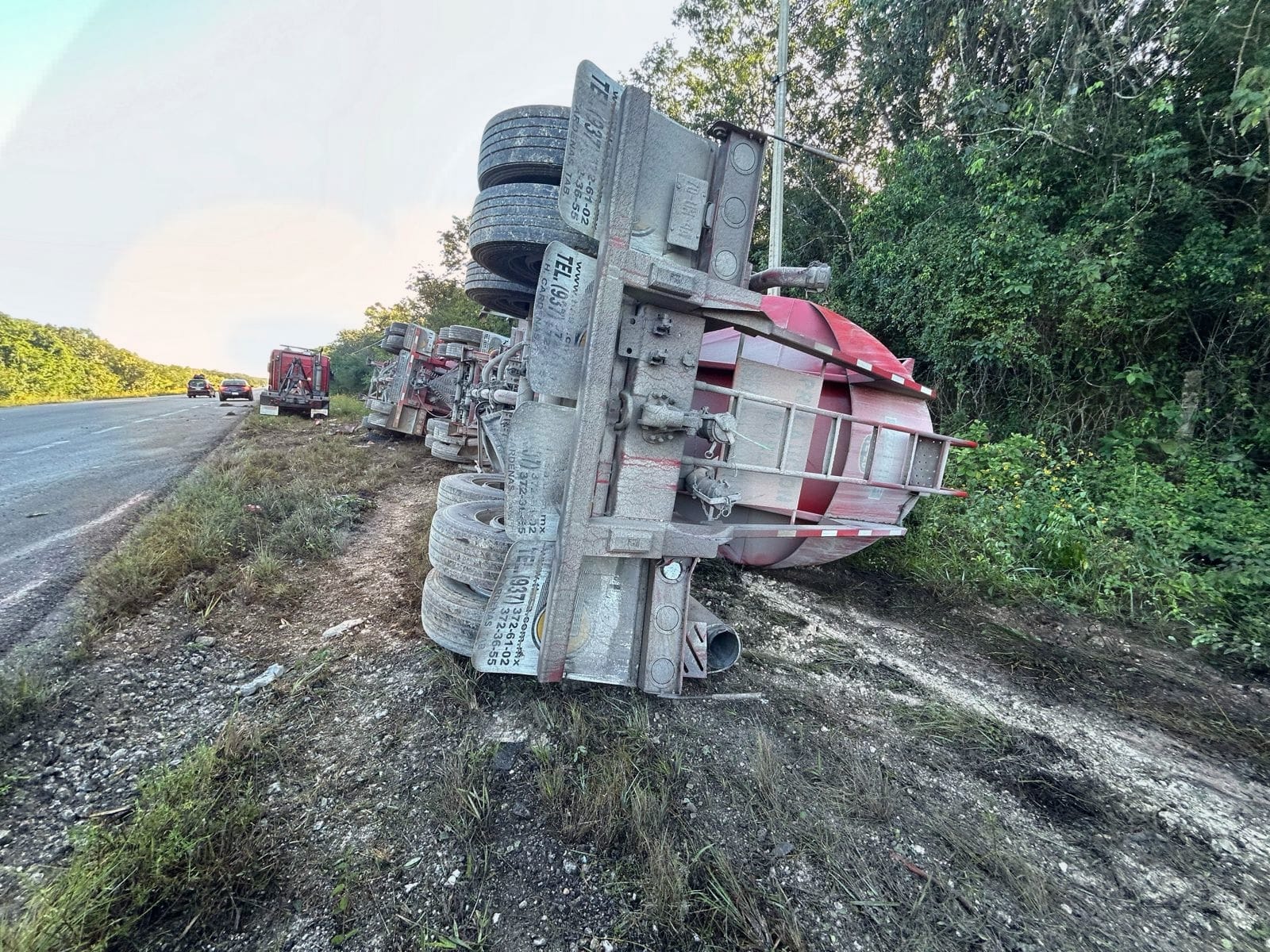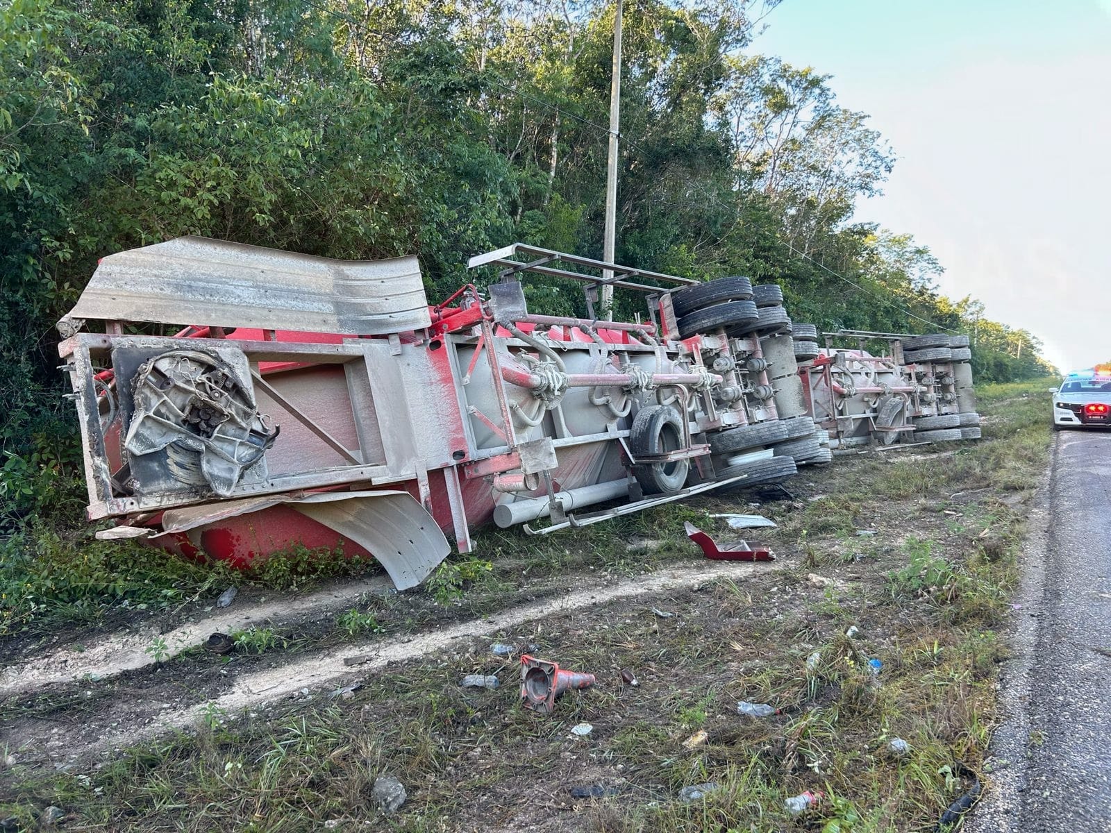 FELIPE CARRILLO PUERTO.- Un tráiler tipo pipa, que transportaba 47 toneladas de cemento a granel, terminó volcado esta madrugada a la orilla de la carretera federal 307, cerca del crucero de Chumpón. No hubo lesionados, solo daños materiales.