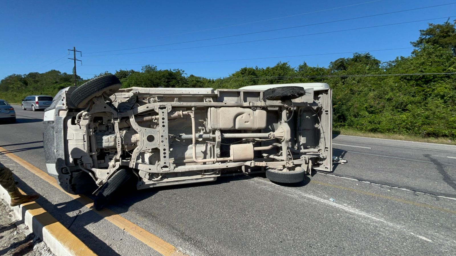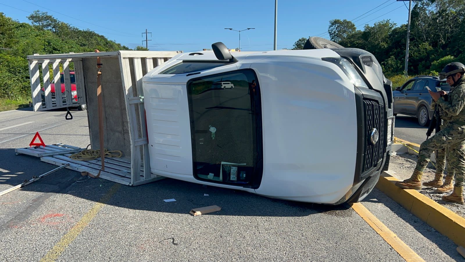PLAYA DEL CARMEN.- Una camioneta terminó volcada sobre la carretera federal 307, en el tramo Playa del Carmen-Tulum, luego que se le reventara un neumático. Este percance dejó como saldo dos lesionados.
