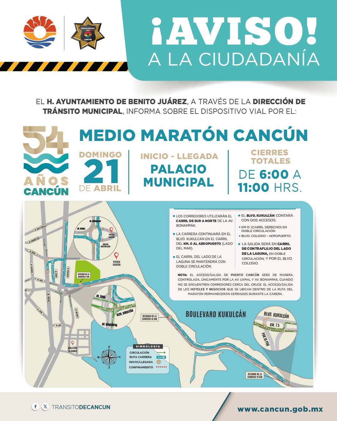 El Ayuntamiento de Benito Juárez, a través de la dirección de Tránsito Municipal, informa que habrá cierres totales de las 6:00 a las 11:00 horas tomando en cuenta que el inicio y llegada de la competencia es en el Palacio Municipal.