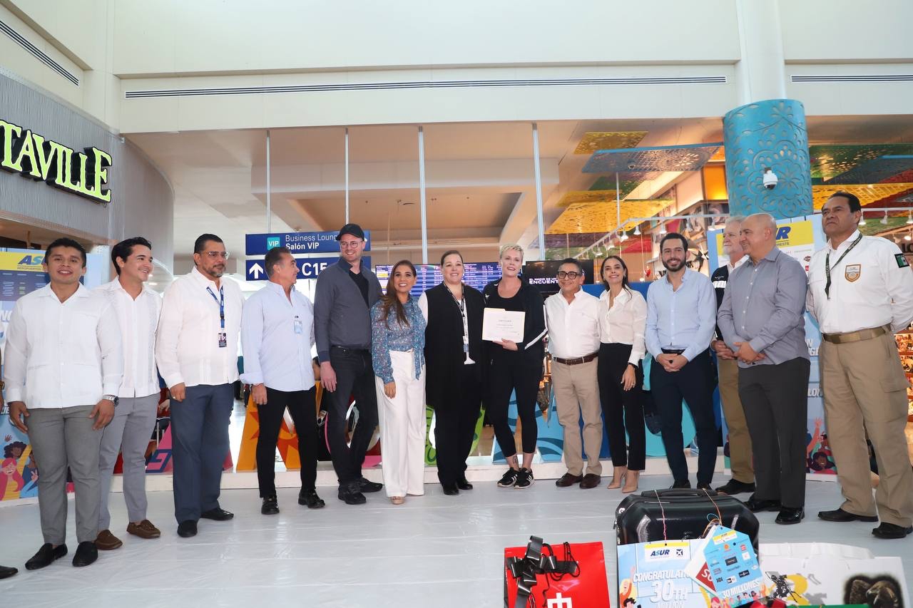 Cancún.- El Aeropuerto Internacional de Cancún atendió a su pasajera número 30 millones en lo que va de este 2022. Hecho con el que se rompe un récord en cuanto a atención de llegada y salida de pasajeros. Se trata de Lisa Marie Strickley originaria de Indiana, Estados Unidos quien en compañía de su esposo Chad Strickley estuvo durante 12 días en el destino, quien a bordo del vuelo AA2422 de American Airlines, regresará a casa, con varios regalos y con la alegría de ser seleccionada como la pasajera 30 millones de este aeropuerto.