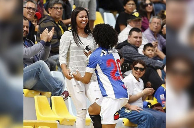Los aficionados presentes en el Estadio Sausalito de Viña del Mar se quedaron estupefactos cuando, tras anotar, el delantero se dirigió a las gradas y le pidió matrimonio a su novia, Gabriela Brito.