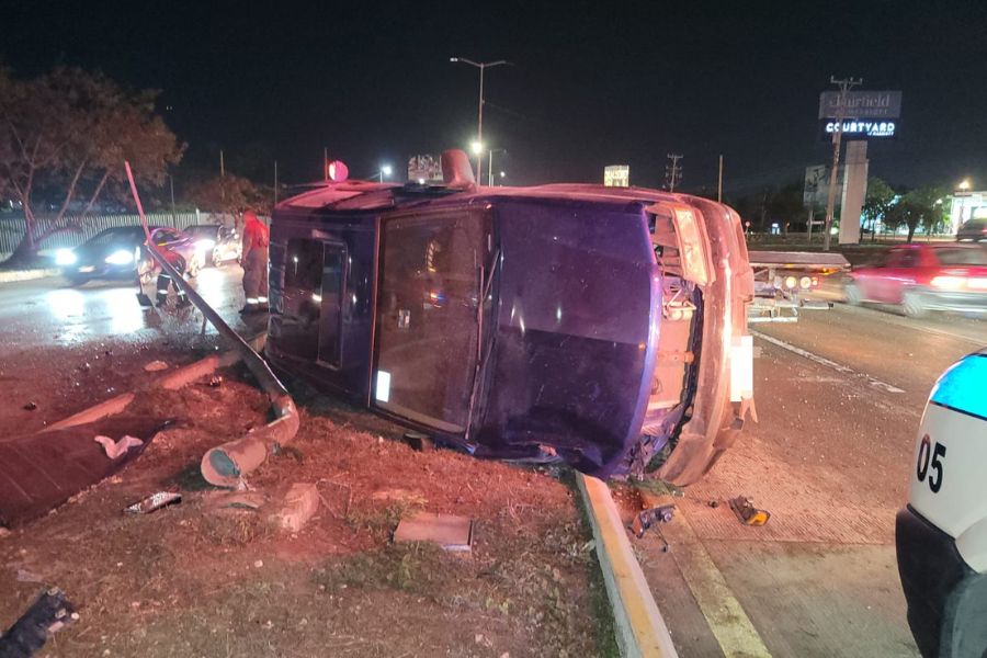 Una camioneta perdió el control y terminó volcada tras derribar una palmera y un poste, frente a la Universidad Tecnológica de Cancún.