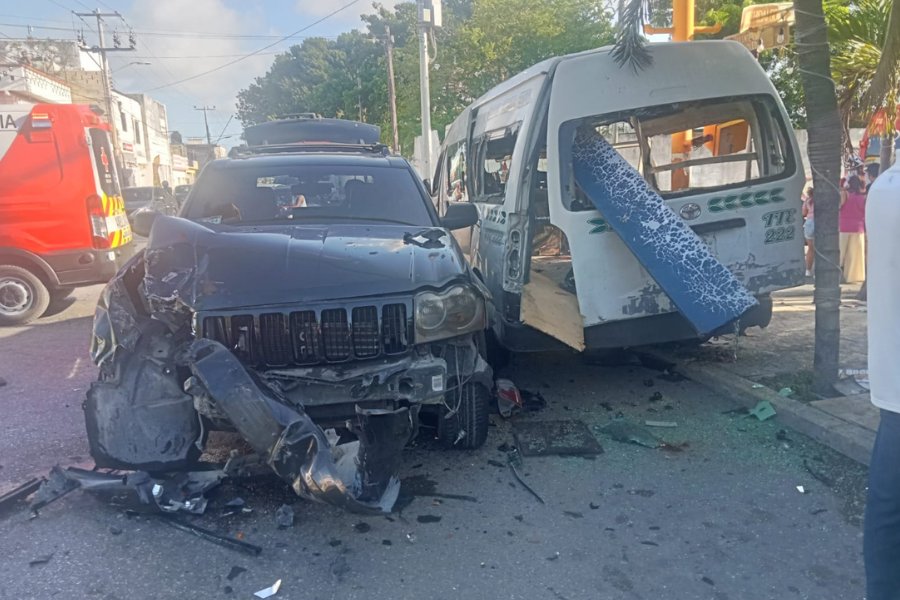 Cancún.- Ocho personas resultaron lesionadas, dos de ellas de gravedad, tras un accidente de tránsito registrado la mañana del domingo en el cruce de las avenidas Miguel Hidalgo (Ruta 5) y Lombardo Toledano, en la supermanzana 73 de Cancún.
